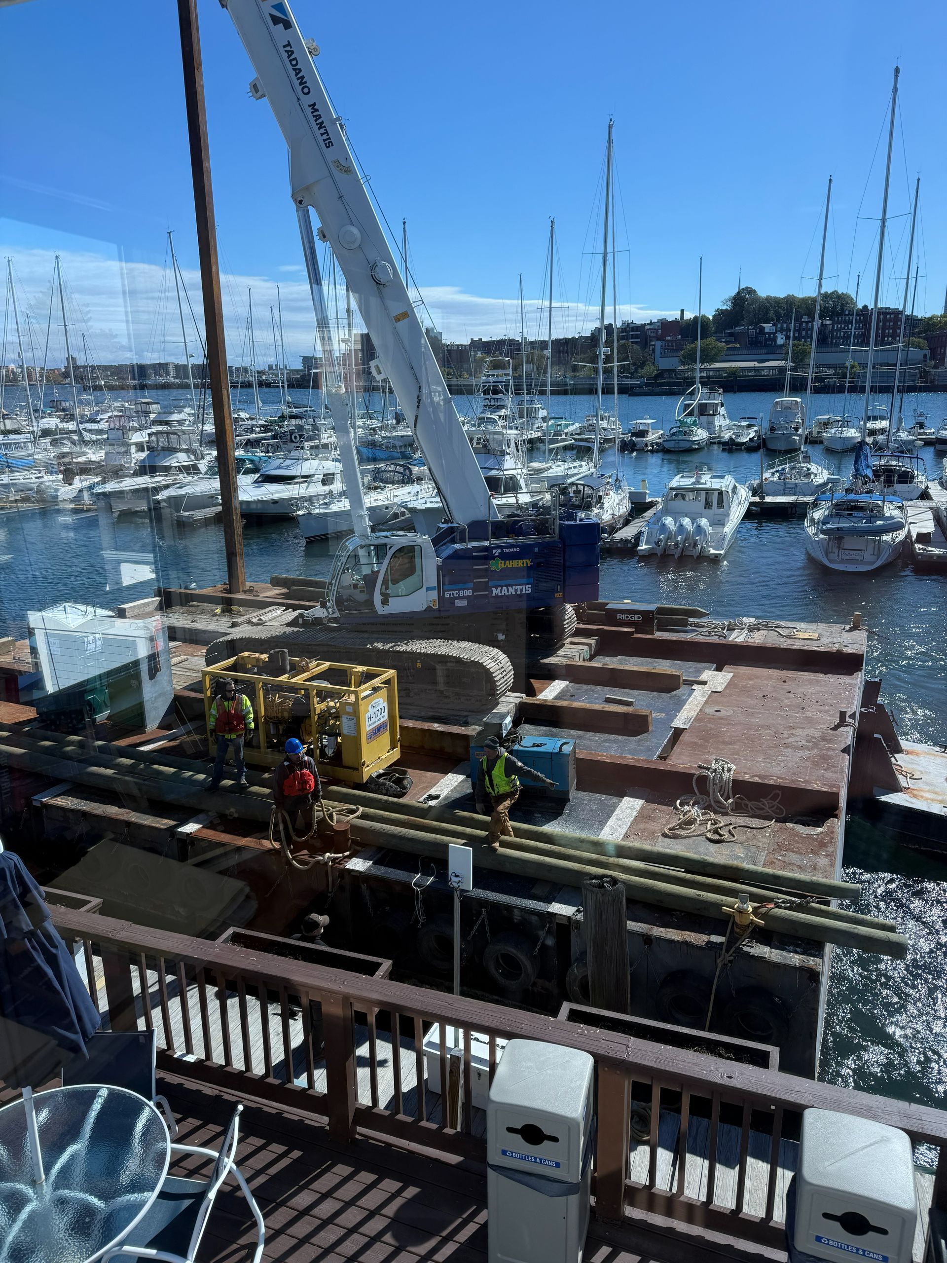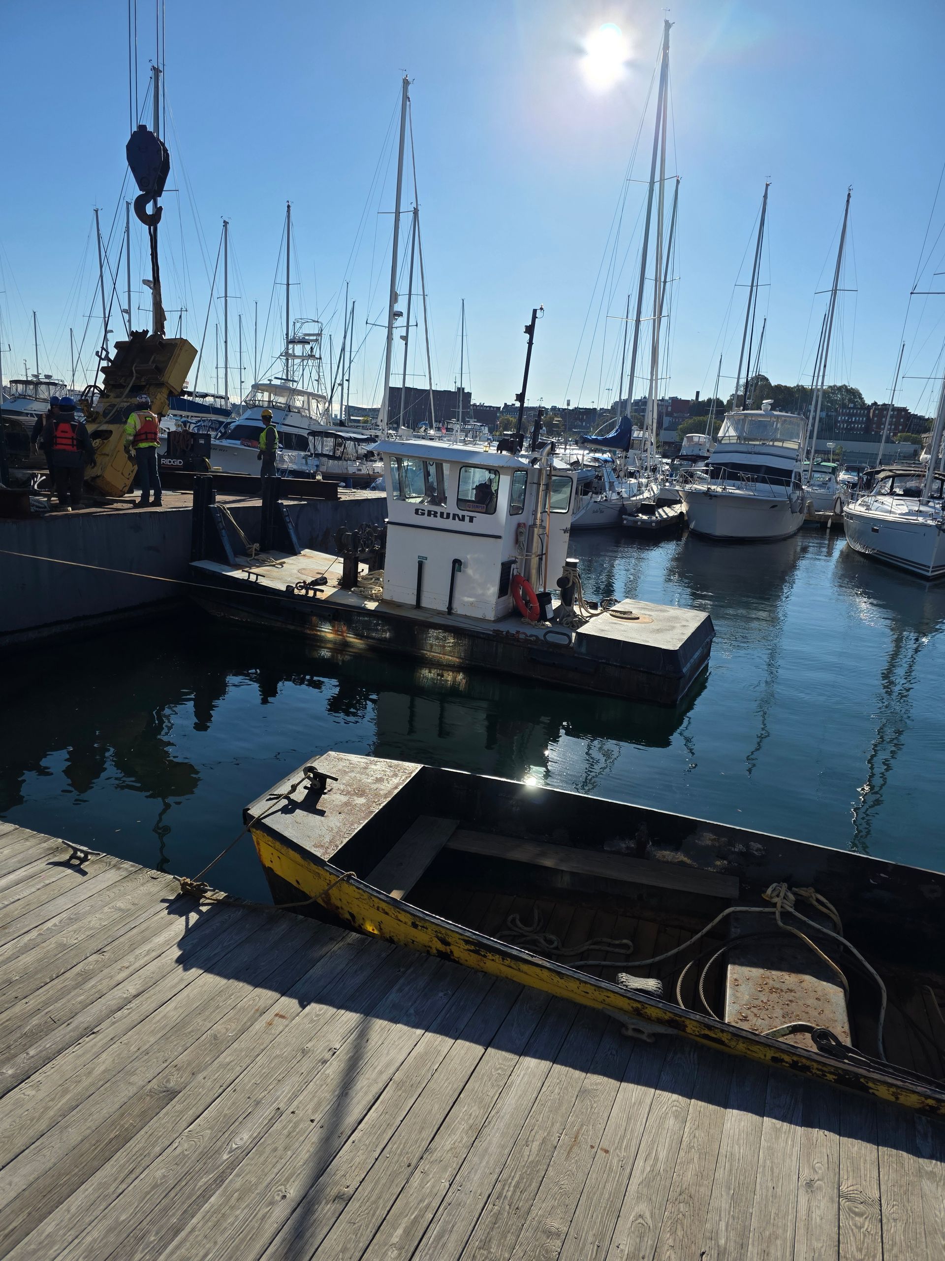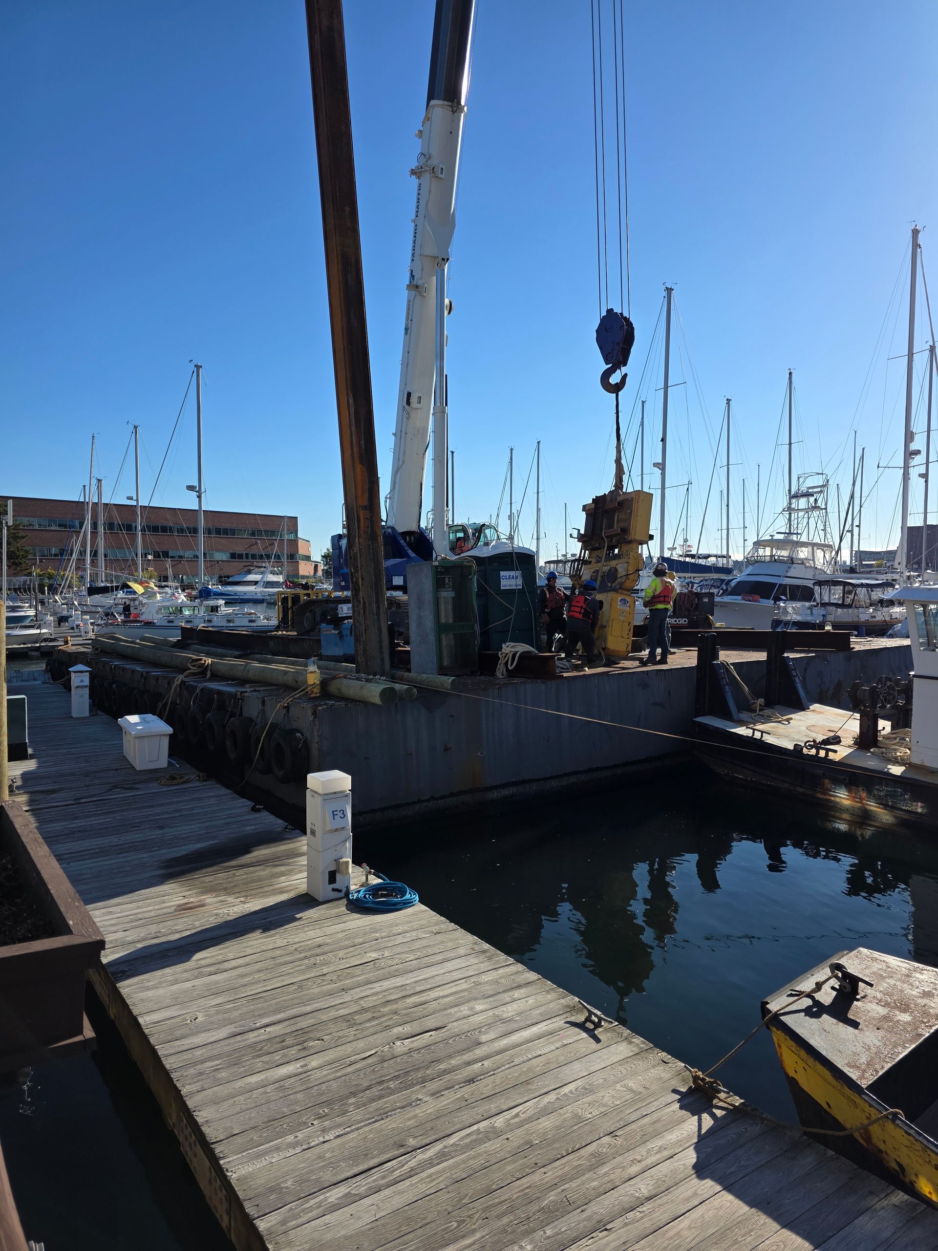 To ensure the safety and quality of our marina, we’ve implemented an ongoing dock replacement program. You’ll find photos of newly replaced docks—installed just six months ago—as well as older docks scheduled for replacement in the coming six months. Due to our popular winter storage program and the steady presence of liveaboards from across New England, shutting down the marina for major overhauls isn’t feasible. Instead, we’ve invested in our own crane and floating barge, allowing us to carry out replacements year-round without interrupting operations. Our in-house team, which includes experienced dock builders and licensed crane operators, works throughout the year to maintain and upgrade our docks to the highest safety standards.